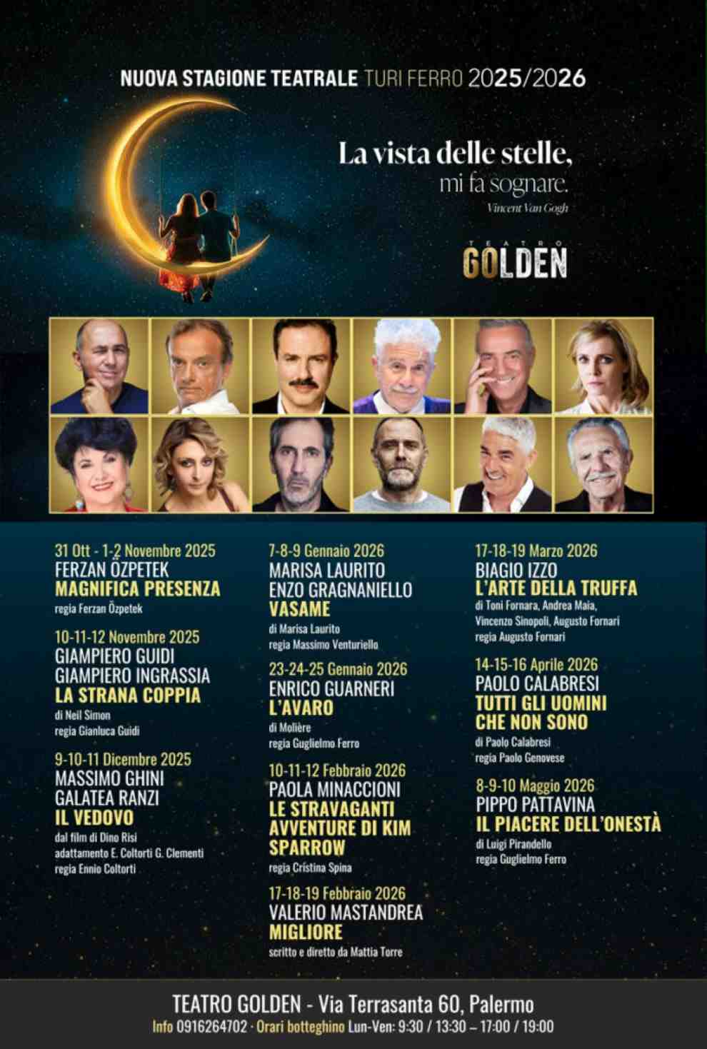 Un cartellone all stars per la nuova stagione teatrale Turi Ferro 2025-2026 al Golden di Palermo. Dall’eccellenza siciliana ai vincitori del David di Donatello nella straordinaria programmazione ospitata presso la sede di via Via Terrasanta, 60.Nomi di prima grandezza, nel panorama italiano e internazionale, per dieci imperdibili appuntamenti che spaziano tra generi e linguaggi differenti.Proposte artistico-culturali di indiscusso pregio all’insegna di un teatro sempre attuale, spettacolare sì, ma profondamente umano.